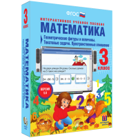 Пособие можно использовать с любыми учебниками, входящими в Федеральный перечень. Интерактивное учебное пособие «Математика 3 класс. Геометрические фигуры и величины. Текстовые задачи. Пространственные отношения» содержит все темы годового учебного курса по математике. В каждую тему включены тестовые контрольные задания, интерактивные упражнения на усвоение теоретического материала и на отработку практических навыков. В пособии использованы следующие медиаобъекты: анимации, аудиосопровождение заданий, интерактивные схемы, работа с виртуальными инструментами, 3-D модели, установление соответствия (соединение), последовательности, обобщение, классификация объектов, кроссворды, интерактивные таблица умножения.